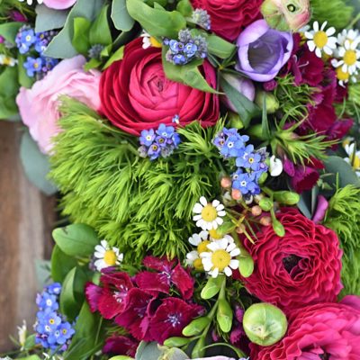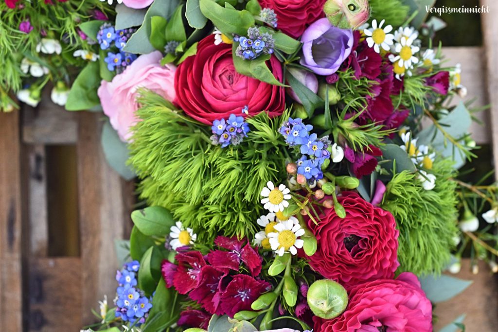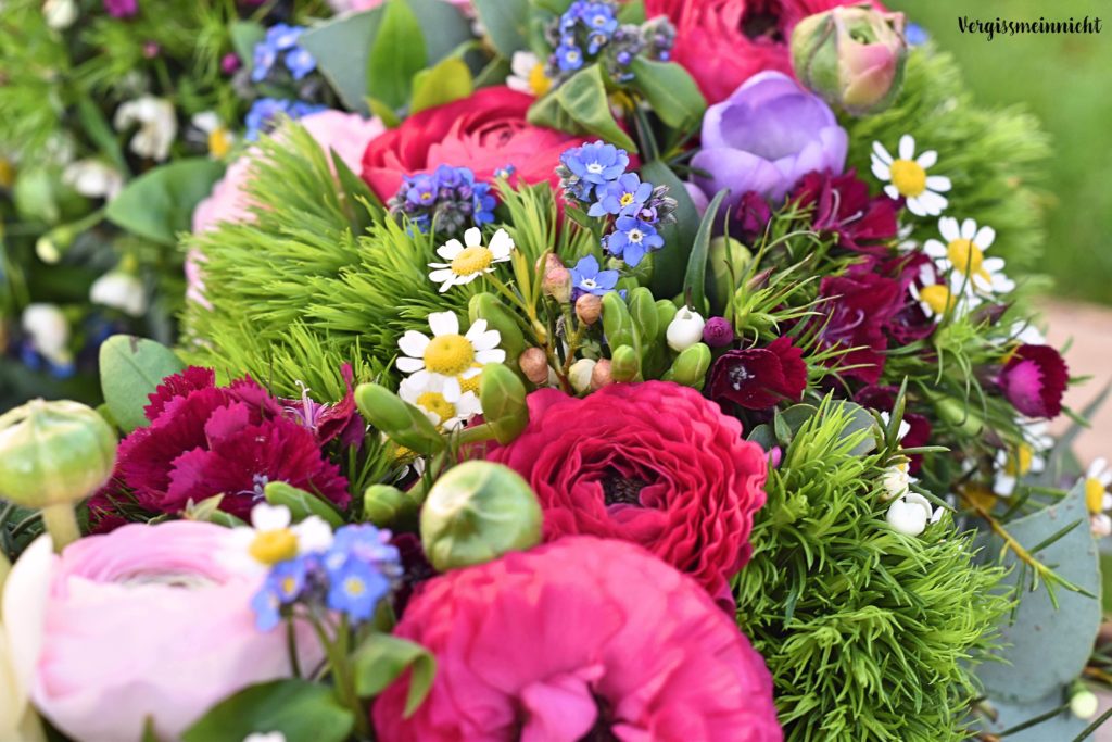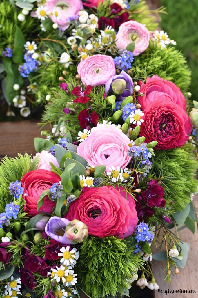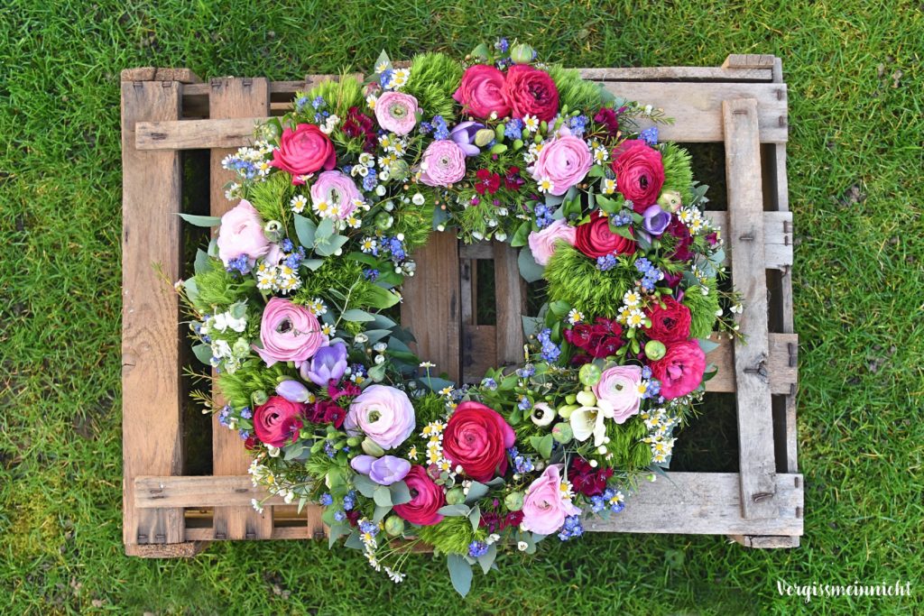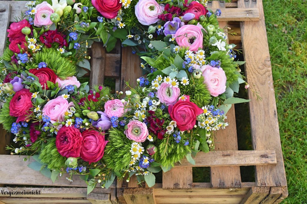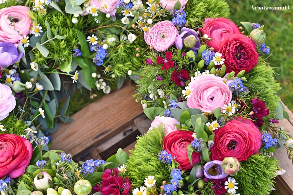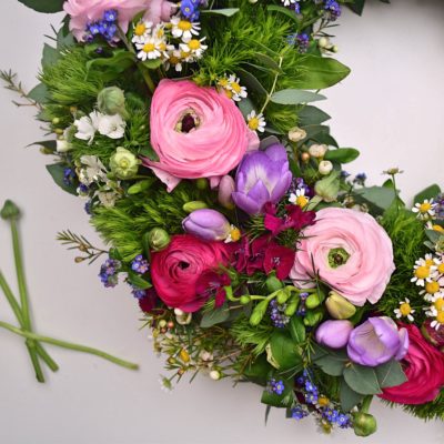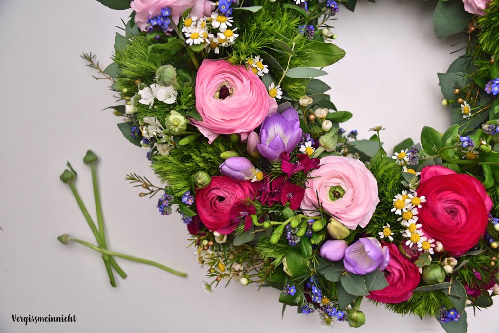 In diesem Beitrag zeige ich dir, wie ein schöner Blumenkranz selbst gemacht werden kann. Damit du es noch besser lernen und verstehen kannst, habe ich extra ein Video für dich erstellt. In diesem Video zeige ich dir Schritt für Schritt, wie du diesen schönen Blumenkranz selbst stecken kannst. Die Auswahl der Blumen kannst du immer selbst treffen, je nach Jahreszeit. Meinen Blumenkranz habe ich zum Frühlingsanfang gesteckt. Deshalb habe ich Ranunkeln, Freesien, Bartnelken, Vergissmeinnicht, Wachsflower und Kamille verwendet.