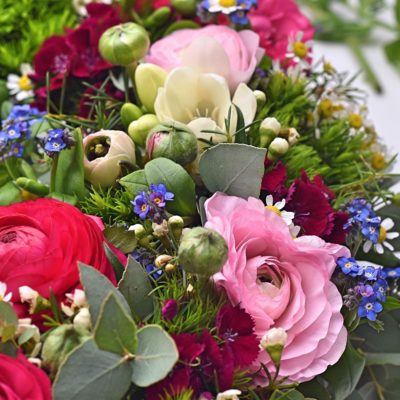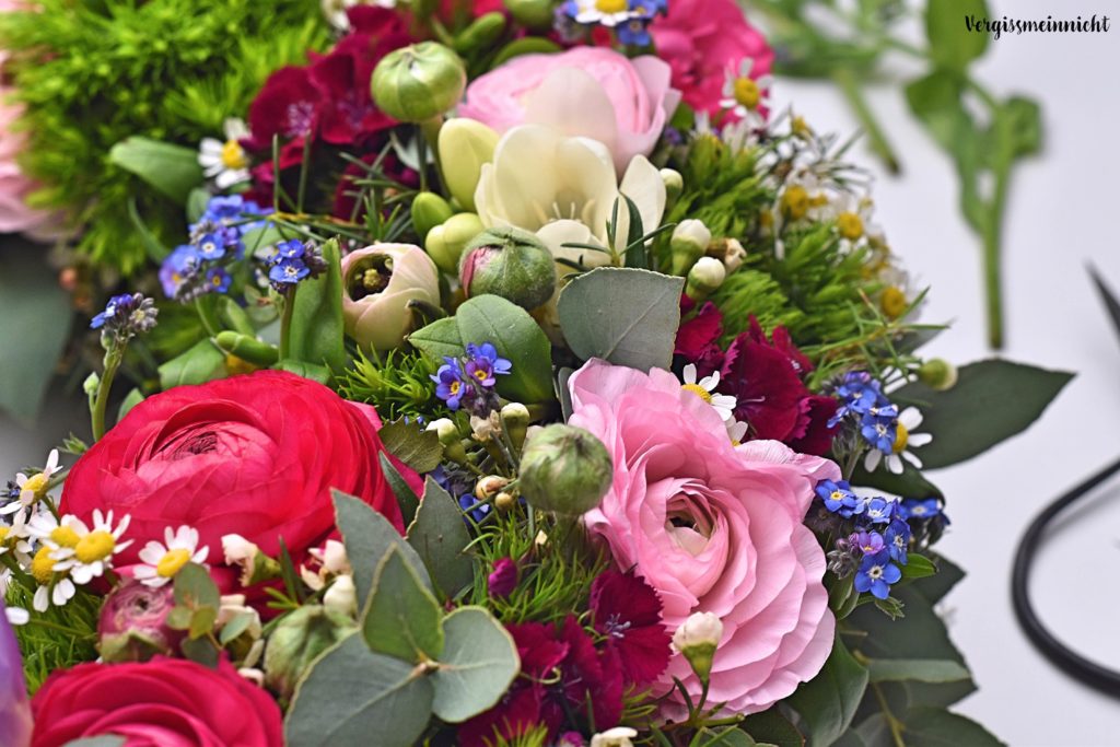 Nun Nach und nach die Blumen stecken. Dazu an einer Stelle anfangen und immer schön die Blumen Abwechseln lassen. Die feinen kleinen Blüten, wie Kamille, Vergissmeinnicht, Ranunkel Seitentriebe und Wachsflower kann immer wieder etwas spielend zwischen oder über die Blüten gesteckt werden. Große Blüten sollten oben oder außen gesteckt werden, nicht innen. Da sonst die Öffnung zu klein wird. Immer wieder etwas Eukalyptus dazwischen stecken. |