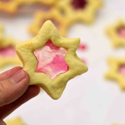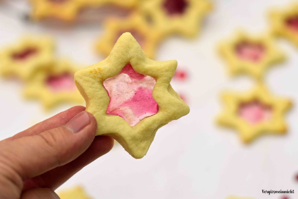 Ich persönlich streiche meine Butterplätzchen nie mit Eigelb ein, jedoch kannst du dies gerne tun, solltest du mein Rezept nach backen. Außerdem habe ich die ausgestochenen Sterne nicht wieder ausgerollt, sondern einfach die kleinen Plätzchen ohne Fenster mit Bonbon-Füllung gebacken. Sollte ich Gäste haben, welche nicht so gerne experimentelle Plätzchen vernaschen wollen, können sie die kleinen Sterne essen.