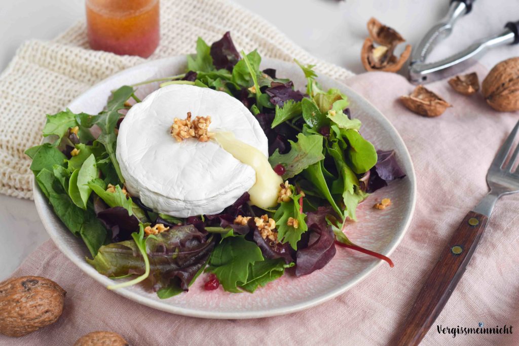 Den Camembert kannst du in kleinen ofenfesten Formen garen oder alternativ kannst du auch einen Camembert in einer Holzverpackung kaufen und diesen direkt in der Verpackung im Ofen garen. Serviert wird der Ofen-Camembert auf einem knackigen Pflücksalat. Jedoch kannst du natürlich auch einen anderen beliebigen Salat verwenden. Sehr gut schmeckt das Gericht beispielsweise auch mit einem Feldsalat. Als Dressing habe ich eine einfache Vinaigrette mit Preiselbeeren zubereitet. Die fruchtigen Preiselbeeren runden das Gericht wunderbar ab. Das Dressing kannst du auch für viele weitere Salat-Rezepte verwenden. Aus diesem Grund habe ich immer ein Glas Preiselbeeren im Kühlschrank.