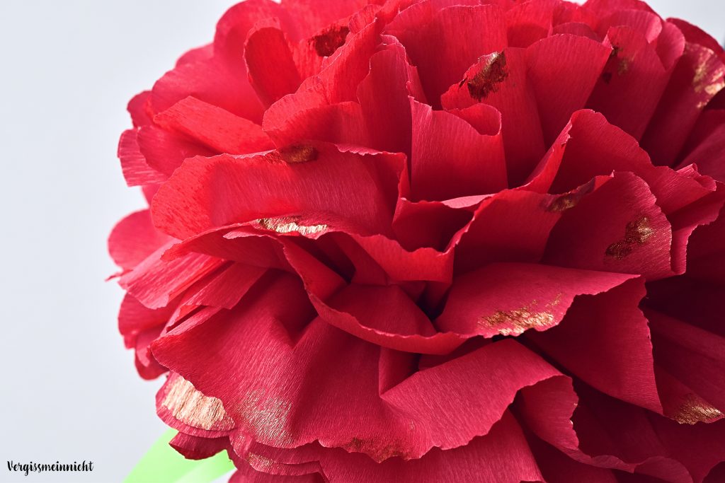 Wie wäre es mit einer künstlichen Pfingstrose aus Papier? Welche du das ganze Jahr in deiner Wohnung in einer hohen Vase stehen lassen kannst! Die Pfingstrose wurde auch Krepppapier hergestellt und später noch ein wenig angemalt mit etwas kupferne Acrylfarbe, somit ist die Blume ein absoluter hingucken.