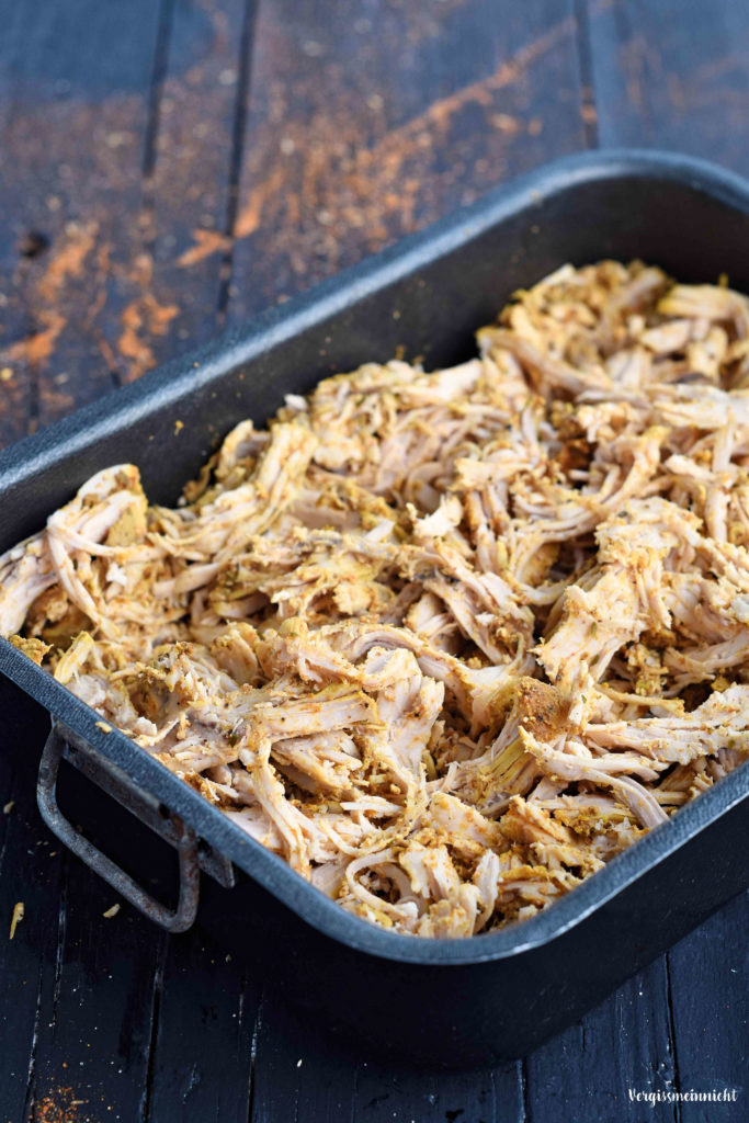 Das Fleisch zum Schluss mit zwei Gabeln zerrupfen. |