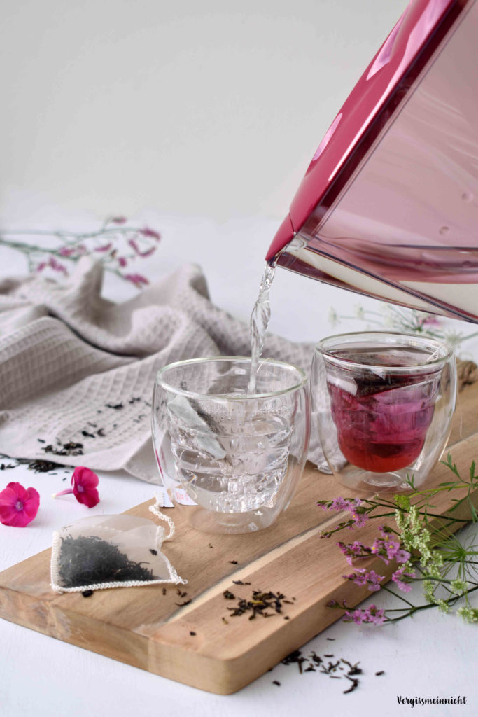 Gehen wir nun auf den wichtigsten Punkt bei der Teezubereitung ein, dem Wasser. Denn das Wasser ist enorm wichtig für den Geschmack. Nicht jede Teesorte verträgt alle Wassereigenschaften. Bei fast allen Teesorten, außer dem Schwarztee, muss das Wasser weich und kalkarm sein. Zwar ist das Wasser aus deutschen Hähnen sehr rein, aber gleichzeitig auch sehr hart. Dieses harte Wasser existiert vor allem in Großstädten. Das idealste Wasser für die Teezubereitung liegt bei 8° deutscher Härte (dH). Bei uns in München zum Beispiel liegt das Wasser bei 16°dH. Um das Wasser rein und weich zu erhalten kannst du einen Tischwasserfilter verwenden. In meinem Fall verwende ich schon seit Jahren, genau so wie meine Mama schon damals, den Tischwasserfilter Marella von BRITA. Dieser macht dein Wasser nicht nur weich und kalkarm, es reinigt das Wasser auch vor Verschmutzungen, welche ggf. auch noch in das Wasser gelangen können trotz einer sehr strenger Kontrollen. Außerdem empfiehlt es sich ein gefiltertes Wasser zu verwenden, welches keinen erkennbaren Eigengeschmack hat.