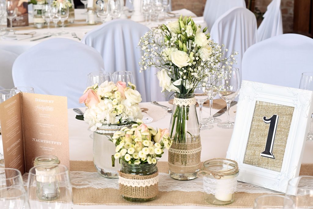 Unten in der Anleitung erkläre ich dir Schritt für Schritt wie ich die Blumendekoration gemacht habe. Außerdem zeige ich dir, wie du die verschiedenen Vasen herstellst. Die Jute- oder Rupfenbänder genannt kannst du auch schon fertig mit Spitze kaufen und brauchst dir nicht mehr so viel Arbeit machen. Ich habe für dich schon mal ein paar Beispiele rausgesucht:Band Rolle mit Weißer Spitze* und Jute Lace Band Handwerk Farbband mit Weisse Spitzen*. Natürlich habe ich dir auch schon Glas Milchflaschen rausgesucht Glasflasche 500 ml*. Die Marmeladen Gläser kannst du dir nach und nach zusammen sammeln.