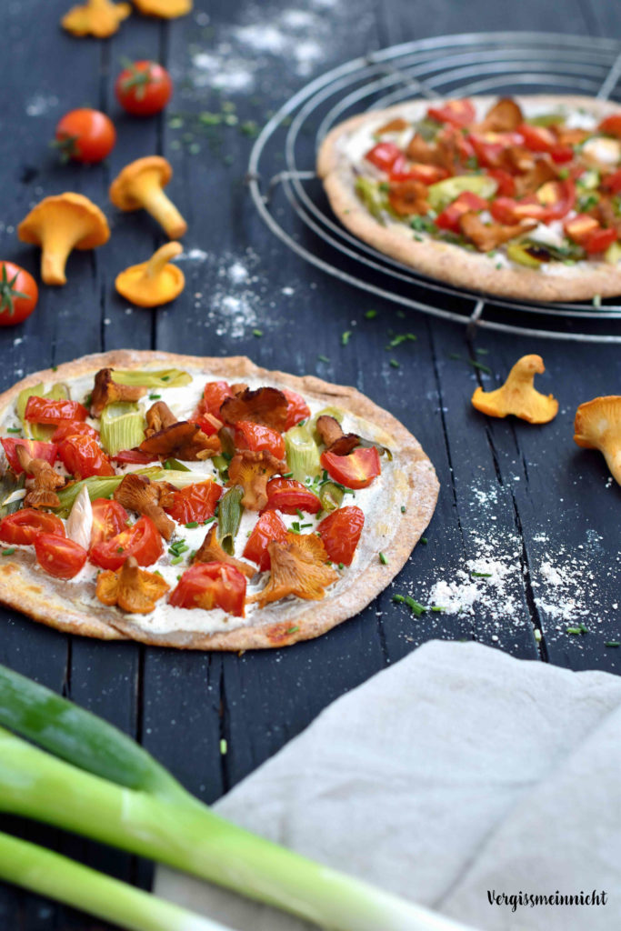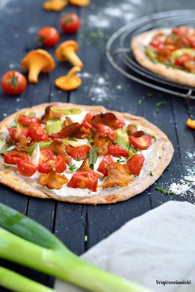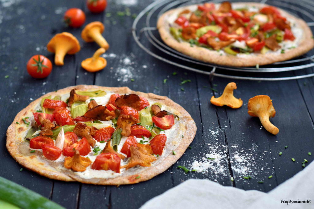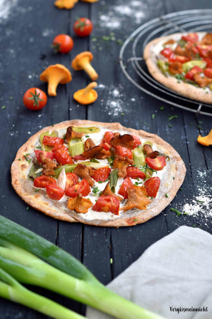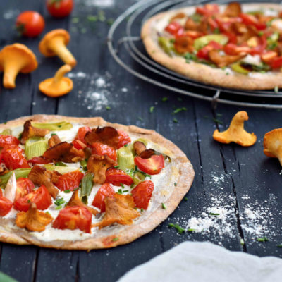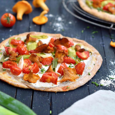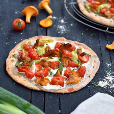 Kürzlich habe ich schon dieses leckere Vollkorn Flammkuchen mit Pfifferlingen und Tomaten Rezept in meiner Instagramstory gezeigt. Da die Rezension so gut war, habe ich mir gedacht, ist dieses Rezept auch einen Blogbeitrag wert. Mein Vollkorn Flammkuchenteig kennst du ja schon aus meinen anderen Rezepten Vollkornflammkuchen mit buntem Gemüse, Vollkorn Flammkuchen mit Ziegenkäse und Walnüssen und Vollkornflammkuchen mit Ziegenkäse und Kirschen. Da mir der Teig so gut schmeckt, verwende ich ihn immer wieder und wandel ihn manchmal noch etwas ab. Ich mache meinen Flammkuchenteig immer selbst und verwende auch keine Hefe. Aber was wirklich immer unterschiedlich ist, ist mein Belag. Dieses Mal gibt es passend zur Pilzsaison auch Pfifferlinge.