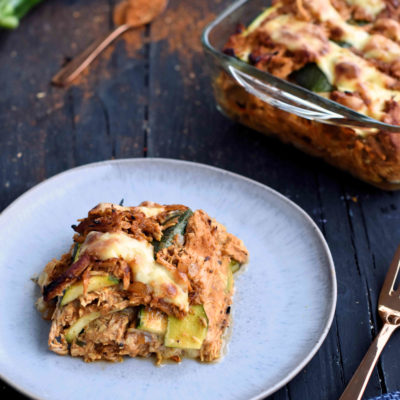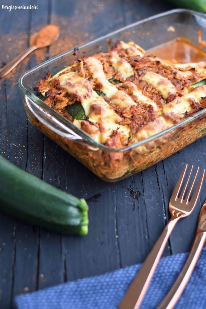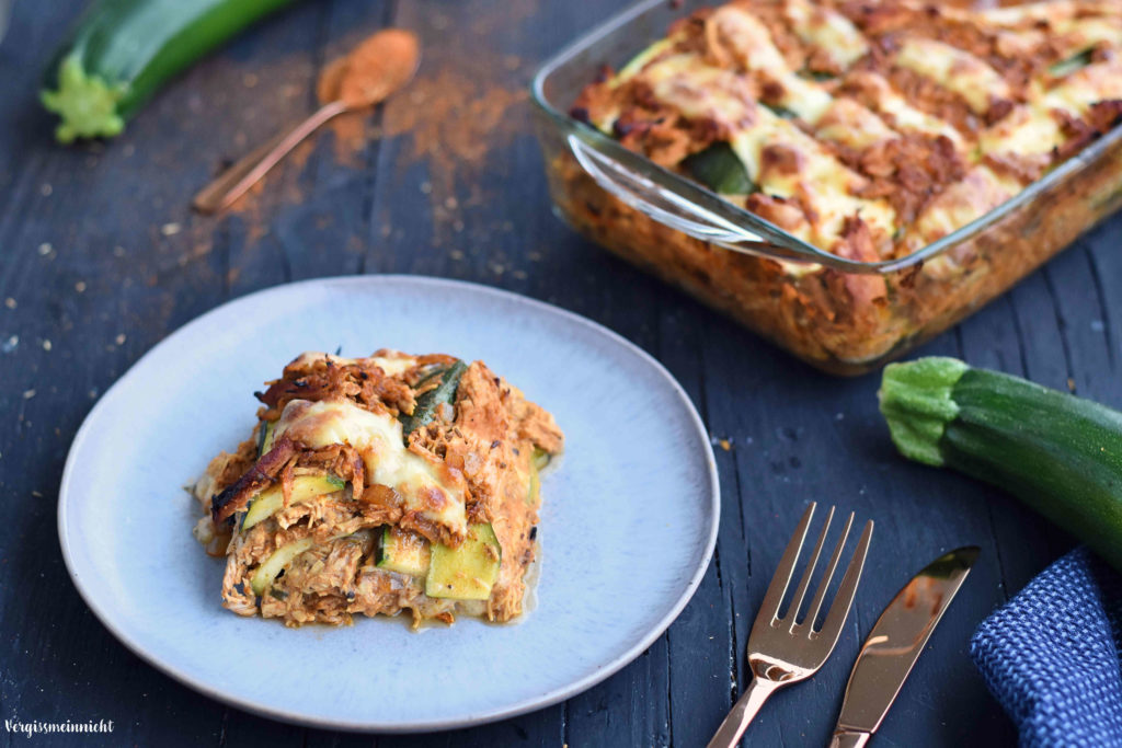 Möchtest du einmal eine andere Lasagne Variante ausprobieren? Gerne stelle ich dir meine schmackhafte Zucchini Lasagne mit pulled Turkey vor. Klassisch kann ja jeder, aus diesem Grund zeige ich dir heute meine Low-Carb Kreation. Statt der Lasagne Platten habe ich Zucchinistreifen verwendet und die Hackfleischfüllung habe ich durch eine leckere Barbecue Soße mit pulled Turkey ersetzt.
